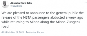 ”We are pleased to announce to the general public the release of the NSTA passengers abducted a week ago while returning to Minna along the Minna-Zungeru road.”his tweet read