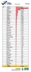 Other states with new cases include Rivers-54, Anambra-31, Ebonyi-23, Imo-23, Kwara-22, Kano-20, Taraba-17, Akwa Ibom-16, FCT-15, Abia-13, Kaduna-13, Osun-5, Edo-4, Oyo-4, Kebbi-3, Ogun-3, Ekiti-2, Nasarawa-1 and Zamfara-1.