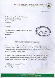 The letter reads: “Pursuant to the dictates of my conscience and my rights as enshrined in the 1999 Constitution of the Federal Republic of Nigeria, I write to hereby resign my appointment as Senior Technical Assistant to the Governor of Ebonyi State,”