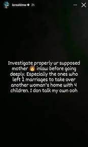 Entertainment Before delving into a serious relationship, Israel DMW advises men to thoroughly investigate their potential mother-in-law. By amebonationblog01@gmail.com December 27, 2023 0 Share Facebook Twitter Google+ Pinterest LinkedIn Email Isreal Aferae, the logistics manager for singer Davido, has advised single men with marriage intentions to conduct thorough investigations into their prospective mother-in-laws. He shared this counsel on his Instastories. Read below for his advice. See also Bobrisky calls out Lagos men; accuses many of them of not brushing their teeth