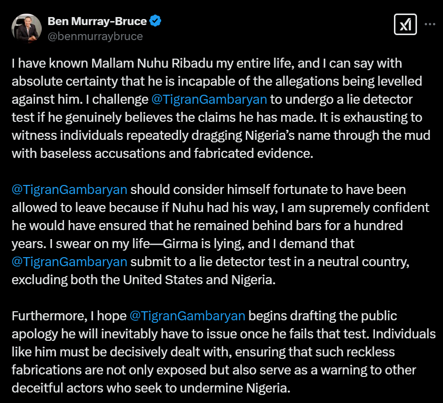“I challenge @TigranGambaryan to undergo a lie detector test if he genuinely believes the claims he has made.” Murray-Bruce also accused Gambaryan of damaging Nigeria’s reputation with his unfounded accusations, advising him to prepare a public apology when he fails the test.