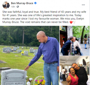”She was faithful, loyal and true. My best friend of 43 years and my wife for 41 years. She was one of life’s greatest inspiration to me. Today marks one year since I lost my favourite woman. We miss you, Evelyn Murray-Bruce. The void remains that can never be filled.”he wrote
