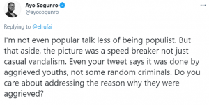 ”I’m not even popular talk less of being populist. But that aside, the picture was a speed breaker not just casual vandalism. Even your tweet says it was done by aggrieved youths, not some random criminals. Do you care about addressing the reason why they were aggrieved?”