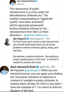 ”Mr Populist @ayosogunro When you are elected Governor, you can apply your shallow, but ‘innovative’ solutions in response to conduct of vandals & sundry criminals. In Kaduna State, till May 29, 2023 in sha Allah I have the mandate of 1.1m voters to enforce the laws of the land.”