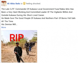 “Inna lillahi WA inna Ilaiyi raju’un, we have lost our brother, Yusuf Baba Idris. Yusuf was the leader of the #CJTF of kukawa. He died as a result of ambush by boko haram two days ago, alongside some military officers while on patrol. May Allah bless them with aljannatul firdaus. We lost a hero” he wrote.