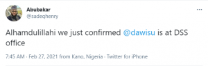 This morning, one of the aides of the Kano state governor who handles the official handle of the state, Abubakar Sadiq, disclosed on Twitter, that Tanko-Yakassai was with the DSS.