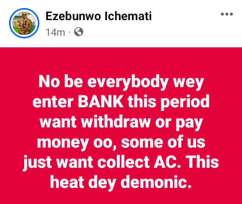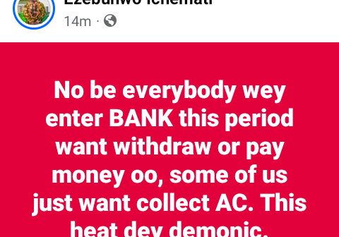 Amidst the current severe heatwave in Nigeria, Ezebunwo Ichemati observed that some individuals are now frequenting banks solely to seek respite from the scorching temperatures by enjoying the cool air from the air conditioners, rather than for financial transactions such as withdrawals or deposits.