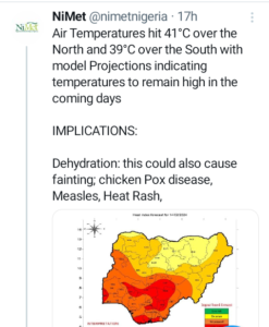 Nigeria is currently grappling with soaring temperatures exceeding 40°C in certain regions of the country. The Nigerian Meteorological Agency (NiMet) issued a statement on Tuesday, February 13, 2024, indicating that air temperatures have reached 41°C in the North and 39°C in the South. NiMet further projected that temperatures are expected to remain elevated in the days ahead.