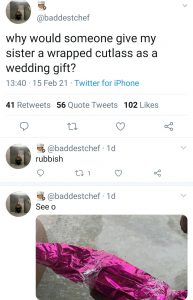 “Why would someone give my sister a wrapped cutlass as a wedding gift?” She asked alongside a photo of the gift.