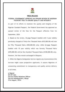 In a statement released on Wednesday night, August 21, the Nigeria Immigration Service says based on the review, a 32-page Passport booklet with 5 year validity previously charged at Thirty-five Thousand Naira (N35,000.00) will now be Fifty Thousand Naira (N50,000.00) only; while 64-page Passport booklet with 10 year validity which was Seventy Thousand Naira (N70,000.00) will be One Hundred Thousand Naira (N100,000.00).According to the statement, the fees remain unchanged in Diaspora.