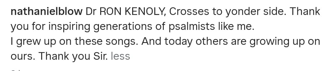 “Dr Ron Kenoly crosses to yonder side. Thank you for inspiring generations of psalmists like me. I grew up on these songs. And today, others are growing up on ours. Thank you sir,” Bassey wrote.
