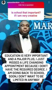 He took to his Instagram page to reveal that he just lost a life-changing appointment because he doesn’t have the required degree. A fan had asked him during a question-and-answer session if school is important for creatives.