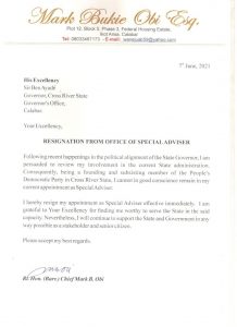 The Special Adviser to Governor Ben Ayade on Sustainable Development Goals (SDGs), Rt Hon. Barrister Mark Bukie Obi has tendered his resignation letter.