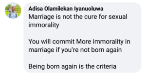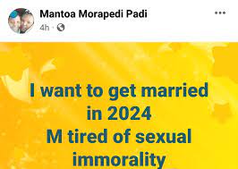 Relationship “I plan to tie the knot in 2024. I am weary of engaging in sexual immorality,” declares a woman. By amebonationblog01@gmail.com January 12, 2024 0 Share Facebook Twitter Google+ Pinterest LinkedIn Email Mantoa Morapedi Padi, a Facebook user, expressed her intention to marry in 2024, citing her weariness with engaging in sexual immorality. See also Delta High Court Judge weeps after DNA test revealed he is not the father of his three adult children