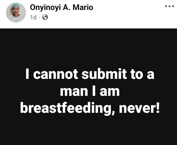 A Nigerian woman, Onyinoyi Mario, has declared that she would never submit to a man she is breastfeeding.