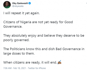 In a tweet she shared, the former Minister of Education said Nigerians absolutely enjoy and believe they deserve to be poorly governed, and politicians understand this.