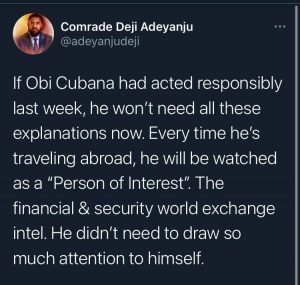 Deji in a tweet he shared, claimed that Obi Cubana will now be watched every time he’s travelling abroad as a “person of interest”.