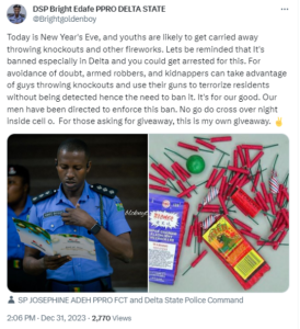 The Delta State Police Command’s spokesperson, DSP Bright Edafe, has issued a reminder to residents of the state regarding the prohibition of fireworks. Through a post on his social media handle, Edafe emphasized the importance of adhering to the ban to avoid spending the New Year’s crossover night in police custody.