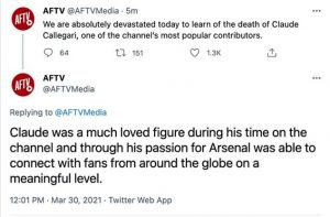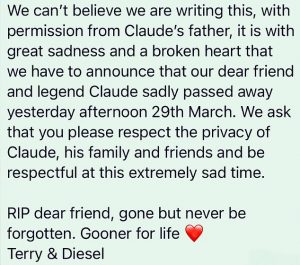 ‘Claude was an unbelievably passionate ?@Arsenal? man & was brilliantly witty, but unfortunately in a world where people take more pride in being ‘savage’ than being nice, he had his ups and downs.