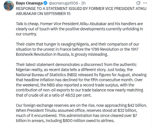 The Presidency has strongly criticized former Vice President Atiku Abubakar following his recent remarks on the state of the nation, dismissing his claims about widespread hunger and looming unrest as misleading and disconnected from current realities in Nigeria.