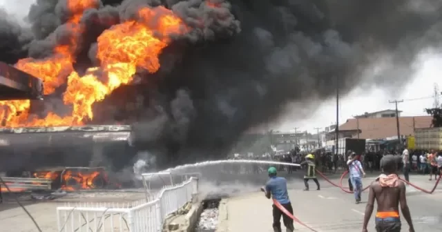 An eyewitness narrated that the tanker, which carried Premium Motor Spirit also know as petrol, was at a filling station in the community to transmit into the underground tank of the filling station through a big pipe when it caught fire.