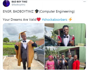 Bad Boy Timz who shared photos from his graduation ceremony, tweeted;