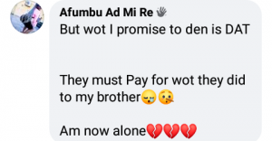 “But what I promise to den is that they must pay for what they did to my brother. I am now alone.” she said.