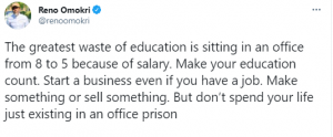 The greatest waste of education is sitting in an office from 8 to 5 because of salary – Reno Omokri