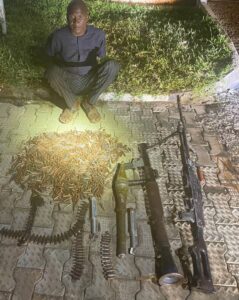 “The suspect, who has been on the wanted list of the security agencies for supplying arms and ammunition to terrorists was captured while on transit to deliver sophisticated weapons, including one General Purpose Machine Gun, a Rocket Propelled Grenade (RPG) Launcher, one RPG Bomb, 1,069 rounds of 7. 62mm (special) ammunition and one belt of 7.62mm (NATO) ammunition.