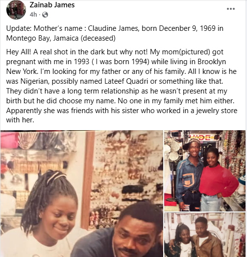 “Update: Mother’s name: Claudine James (deceased). A real shot in the dark, but why not! My mom got pregnant with me in 1993 while living in Brooklyn, New York. I’m looking for my father or any of his family. All I know is he was Nigerian, possibly named Lateef Quadri or something similar. They didn’t have a long-term relationship as he wasn’t present at my birth, but he did choose my name. No one in my family met him either. Apparently, she was friends with his sister who worked in a jewelry store with her,” she wrote.