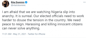 ”I am afraid that we are watching Nigeria slip into anarchy. It is surreal. Our elected officials need to work harder to douse the tension in the country. We need peace to reign. Harassing and killing innocent citizens can never solve anything.”