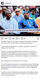 “I declined the Ibadan ‘Opposition Summit’. Nigerians deserve a genuine alternative, not recycled failure,” he wrote.