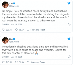 “I’m single,” she wrote. “I’ve endured too much betrayal and hurt behind the scenes for a false narrative to be circulating that degrades my character. Presents don’t band aid scars and the love isn’t real when the intimacy is given to other women.”