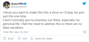 Following Saweetie’s announcement, Quavo shared his own tweets, saying that he had love for her but she isn’t the woman he thought she was.