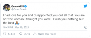 Her tweet suggested that Quavo had been caught cheating.