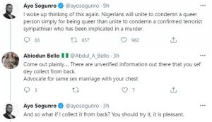It started when Ayo on his Twitter handle, mentioned that Nigerians will unite to condemn queer people than condemn government officials.  He wrote;